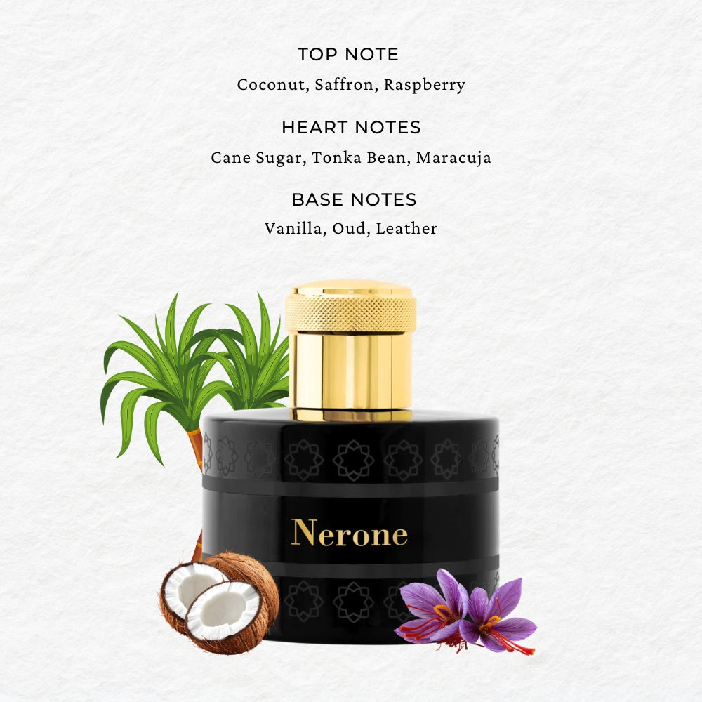 Steeped in art and genius, this fragrance evokes the magnificence of the Domus Aurea. The sweet and enveloping notes of coconut intertwine with vibrant saffron, while the juicy and bold raspberry offers a unique sensory experience. The scent of coconut manifests an exotic, almost imperial elegance. At the heart of this olfactory work, the warm and enveloping notes of cane sugar and tonka bean emerge. The essence of passion fruit adds a touch of eccentricity. The base reveals the power of oud, deep and mysterious, caressed by notes of leather.